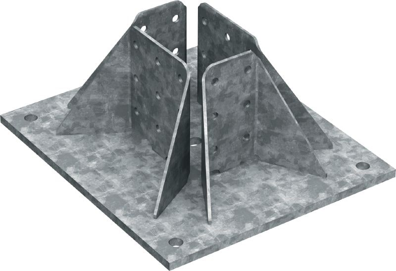 Base connector for anchoring 3D, heavy-duty MT-100 girder structures to concrete, for outdoor use with low pollution